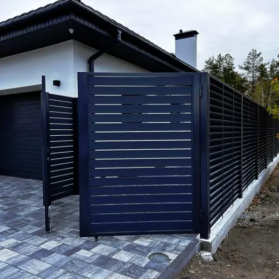Комбинированный забор в современном стиле. Фасадная часть - забор ранчо из металлопланкена RAL7024 МАТТЕ в изысканном оттенке «Серый графит» с матовой поверхностью, придающей конструкции строгую и солидную выразительность. Внутренняя и боковая части - забор типа «Еврожалюзи» того же цвета и двустороннего исполнения, что обеспечивает цельный внешний вид, гармоничное сочетание элементов и практичную функциональность. Такое решение объединяет эстетичность, надежность и долговечность, подчеркивая современный архитектурный облик территории.